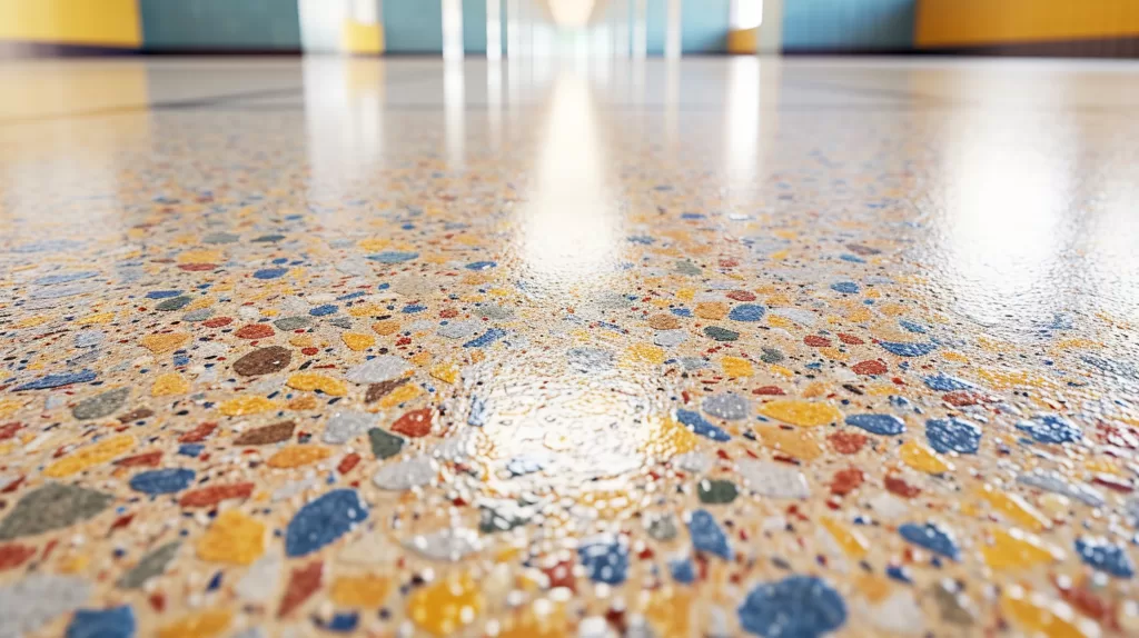 एपॉक्सी रेजिन को संगमरमर, ग्रेनाइट, या कांच के चिप्स के साथ मिलाकर, यह प्रकार की फ्लोरिंग एक शानदार, seamless फिनिश प्रदान करती है। इसका उपयोग अक्सर हवाई अड्डों, मॉल, और कार्यालयों में इसके सौंदर्यात्मक मूल्य और टिकाऊपन के लिए किया जाता है।
