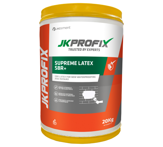 JKPROFIX SUPREME LATEX SBR+: High-performance, multipurpose solution for repairing spalled concrete and waterproofing toilets and roofs, bonds strongly to old and new concrete and plaster.