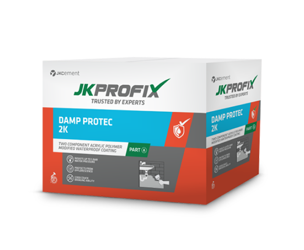 JKPROFIX DAMP PROTEC 2K is a dual-component acrylic cementitious coating that cures to seal washrooms, water bodies, and small roofs against water and moisture ingress, ensuring a watertight structure.