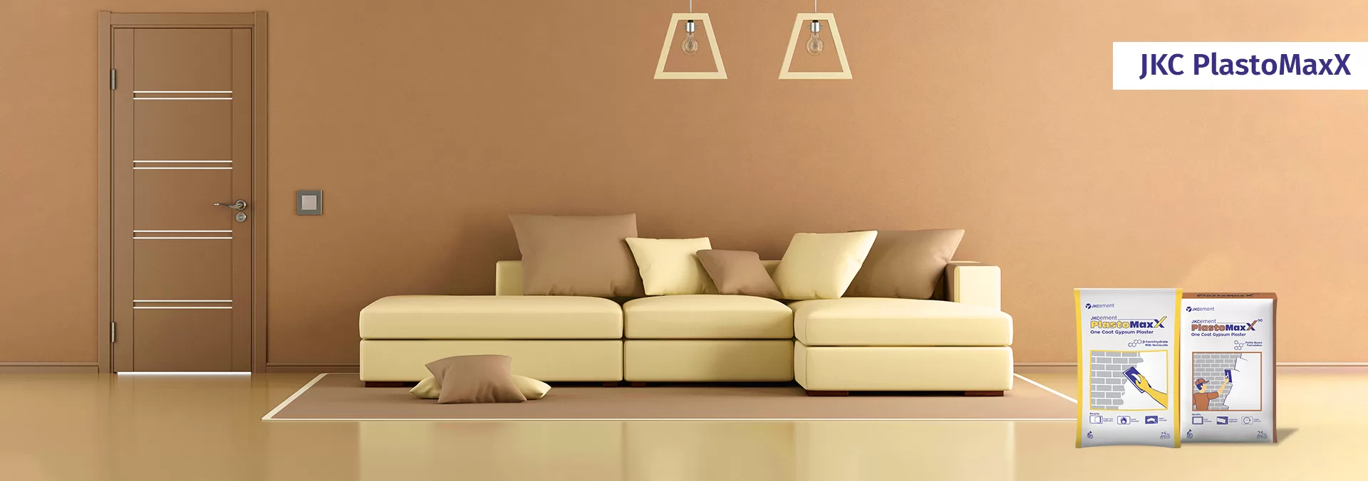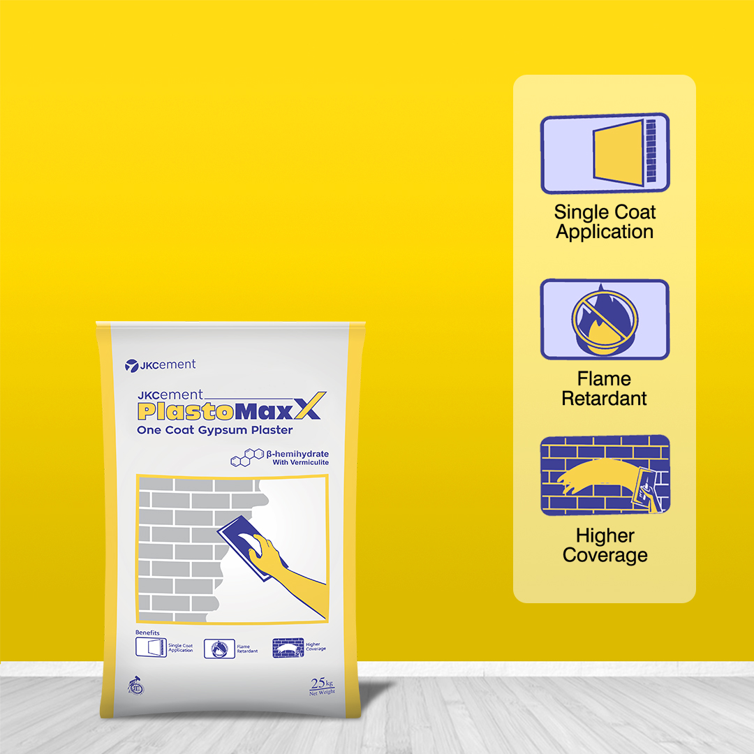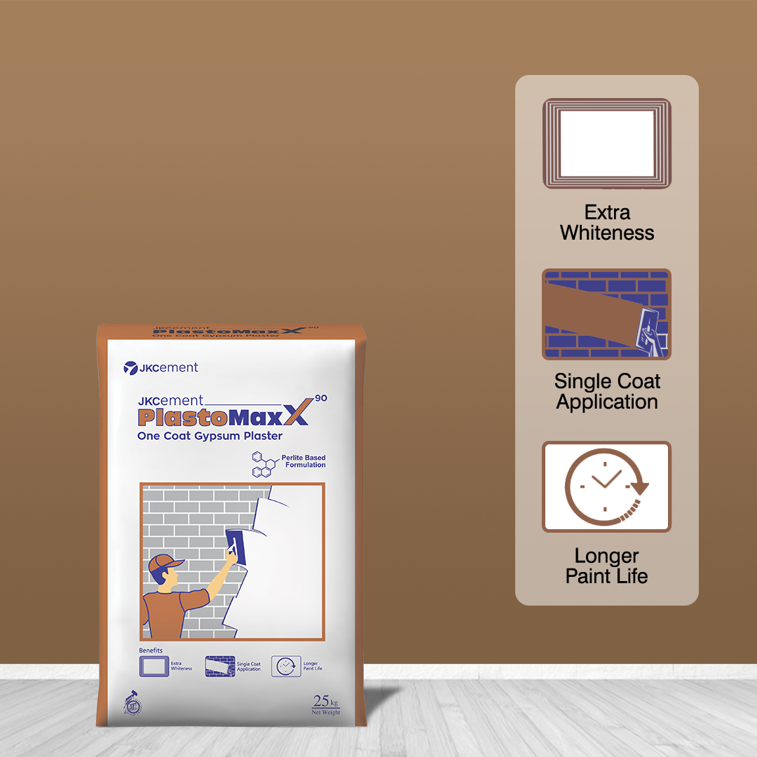 JKC PlastoMaxX is a gypsum-based one coat plaster suitable for application on brick, block and concrete surfaces. Its vermiculite based ß-hemihydrate formulation ensures working and setting characteristics. Its lightweight aggregates improve the plaster's workability, coverage, application and post-usage behaviour. It provides a smooth matt finish to the surface and makes it ready for painting.