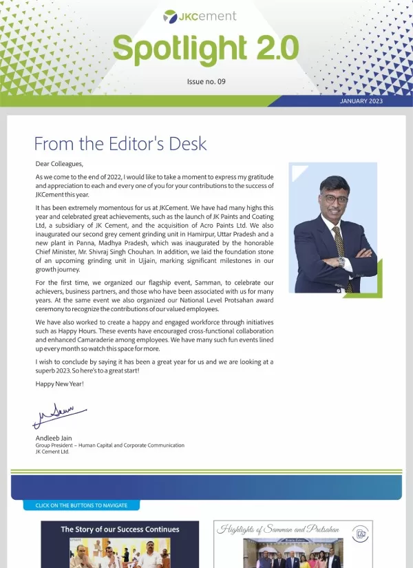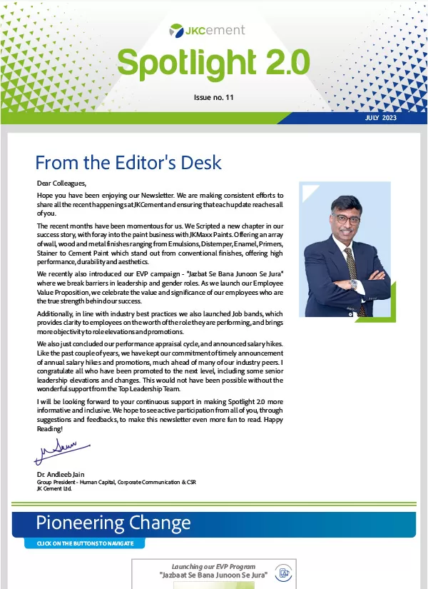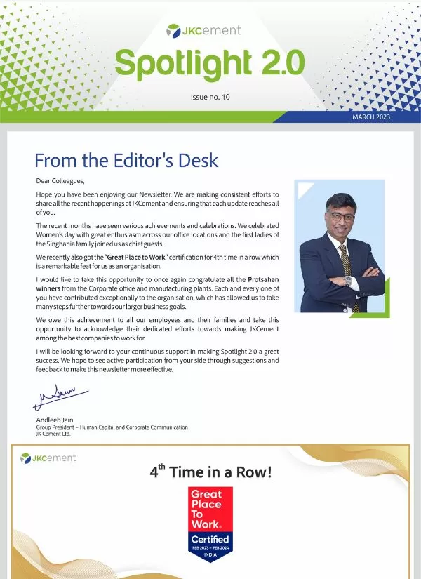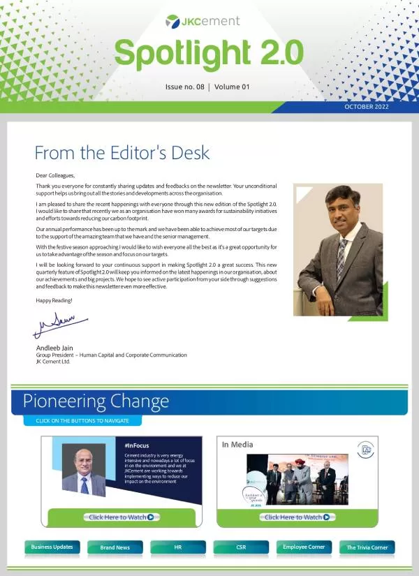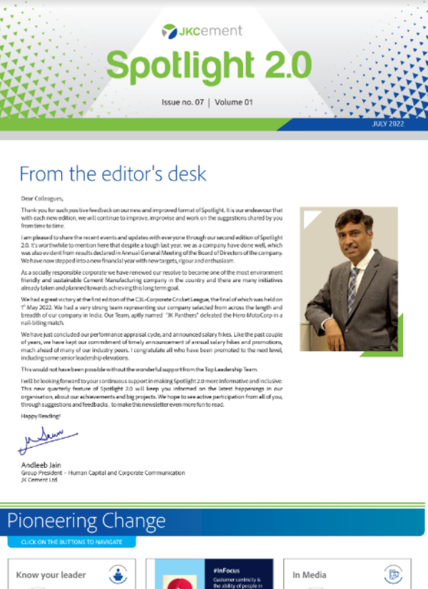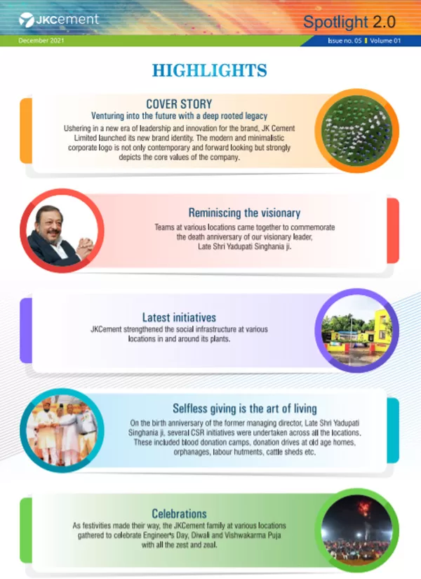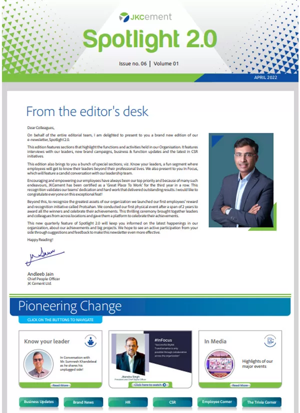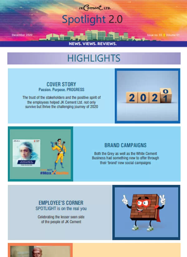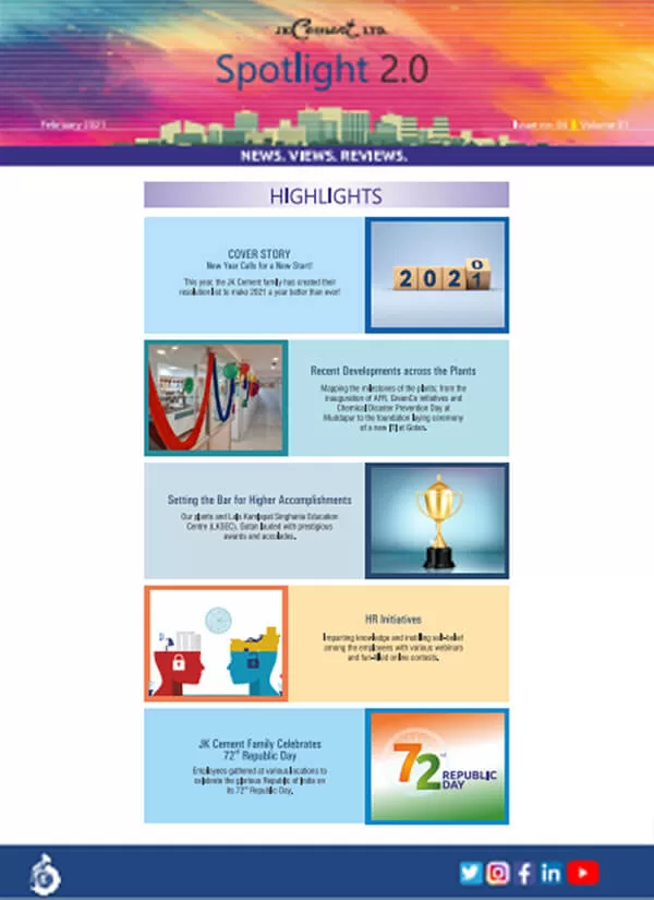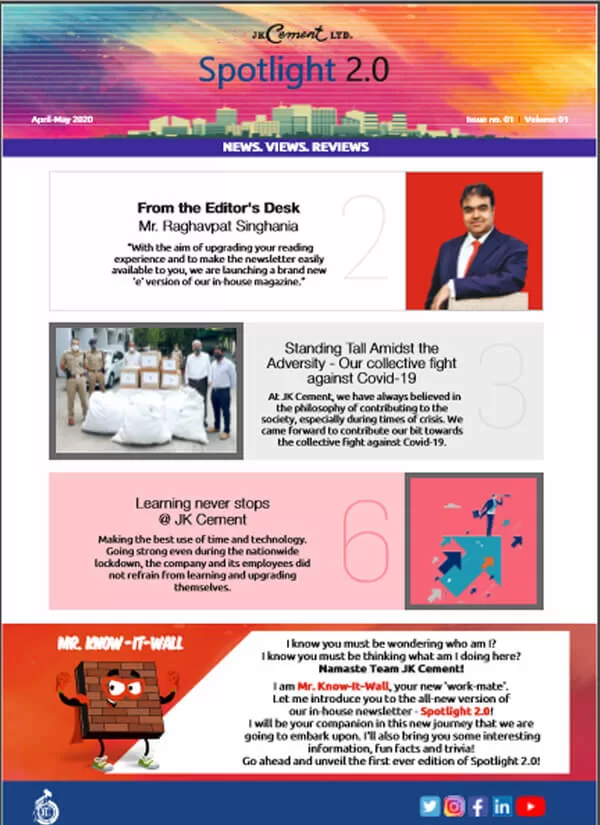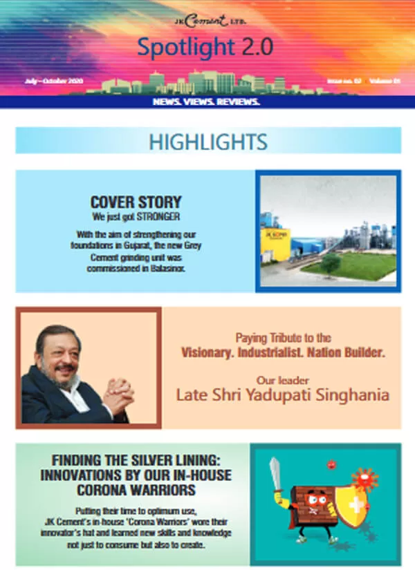 Launched in January 2010, the company newsletter, JK Spotlight has been a great unifier for our employees, channel partners and stakeholders, keeping them updated about the developments across the organization. With the aim of enhancing the reading experience for the members of the JK Cement family, we have launched a contemporary, ‘electronic’ version of our popular magazine – Spotlight 2.0