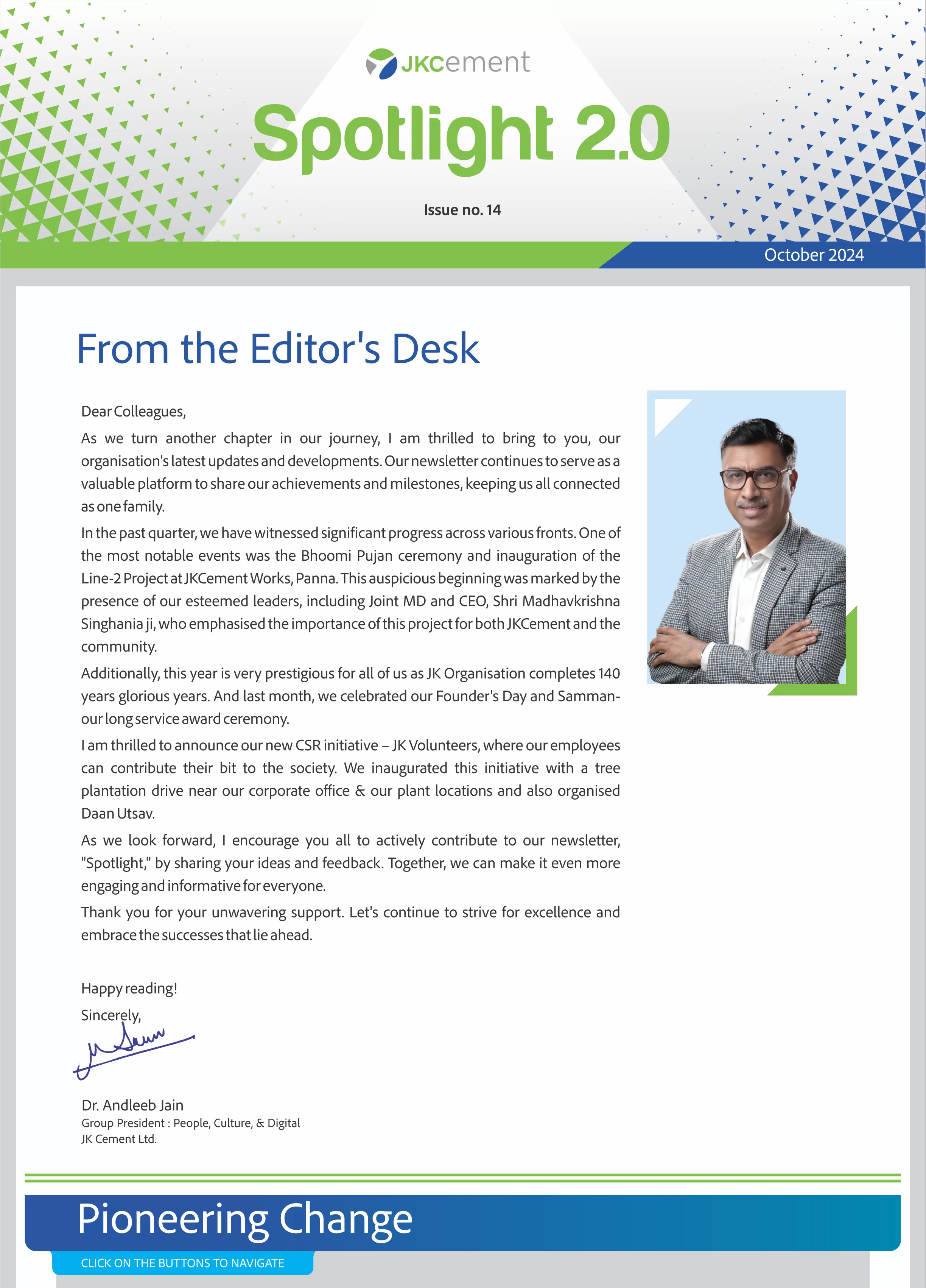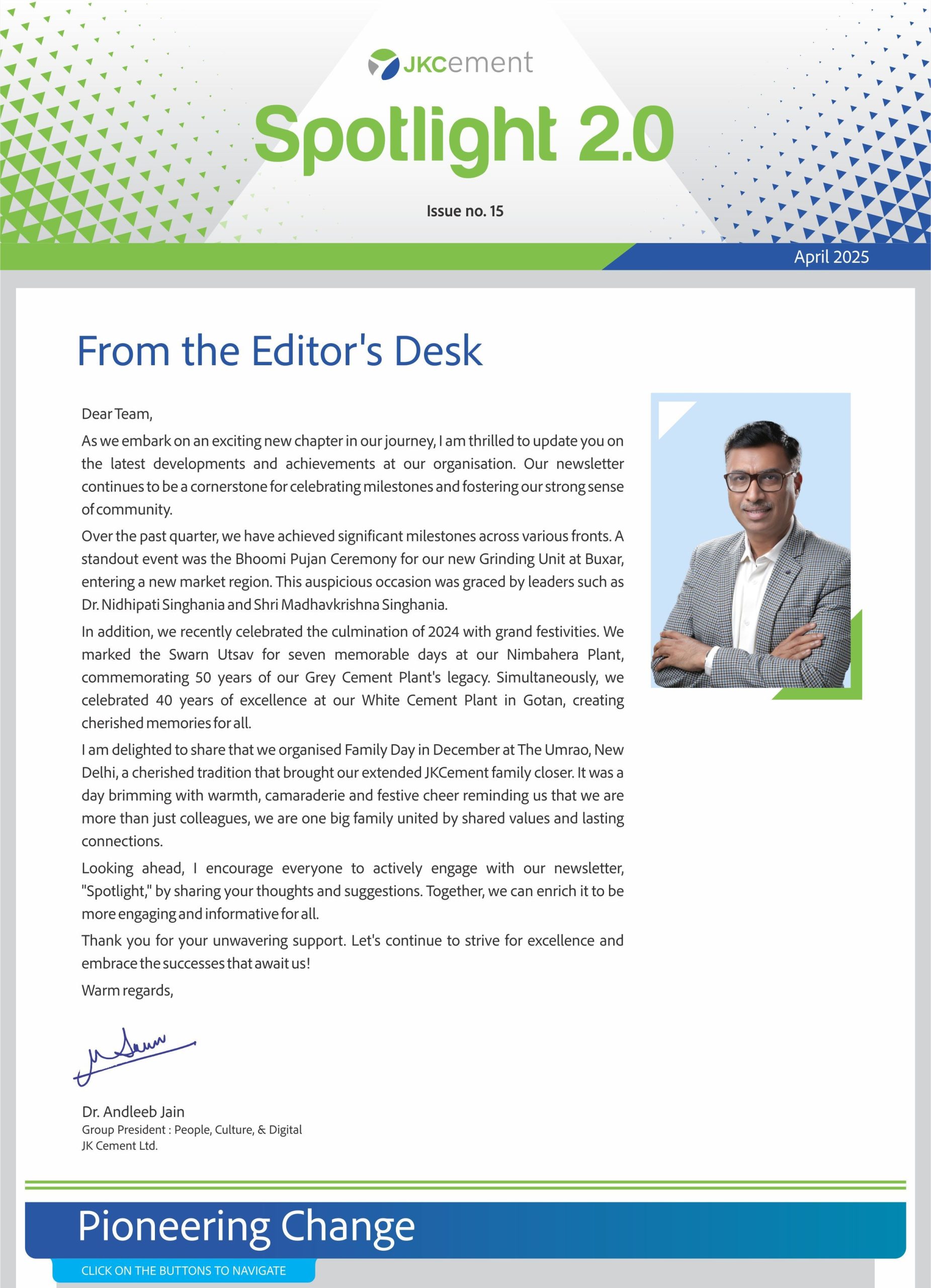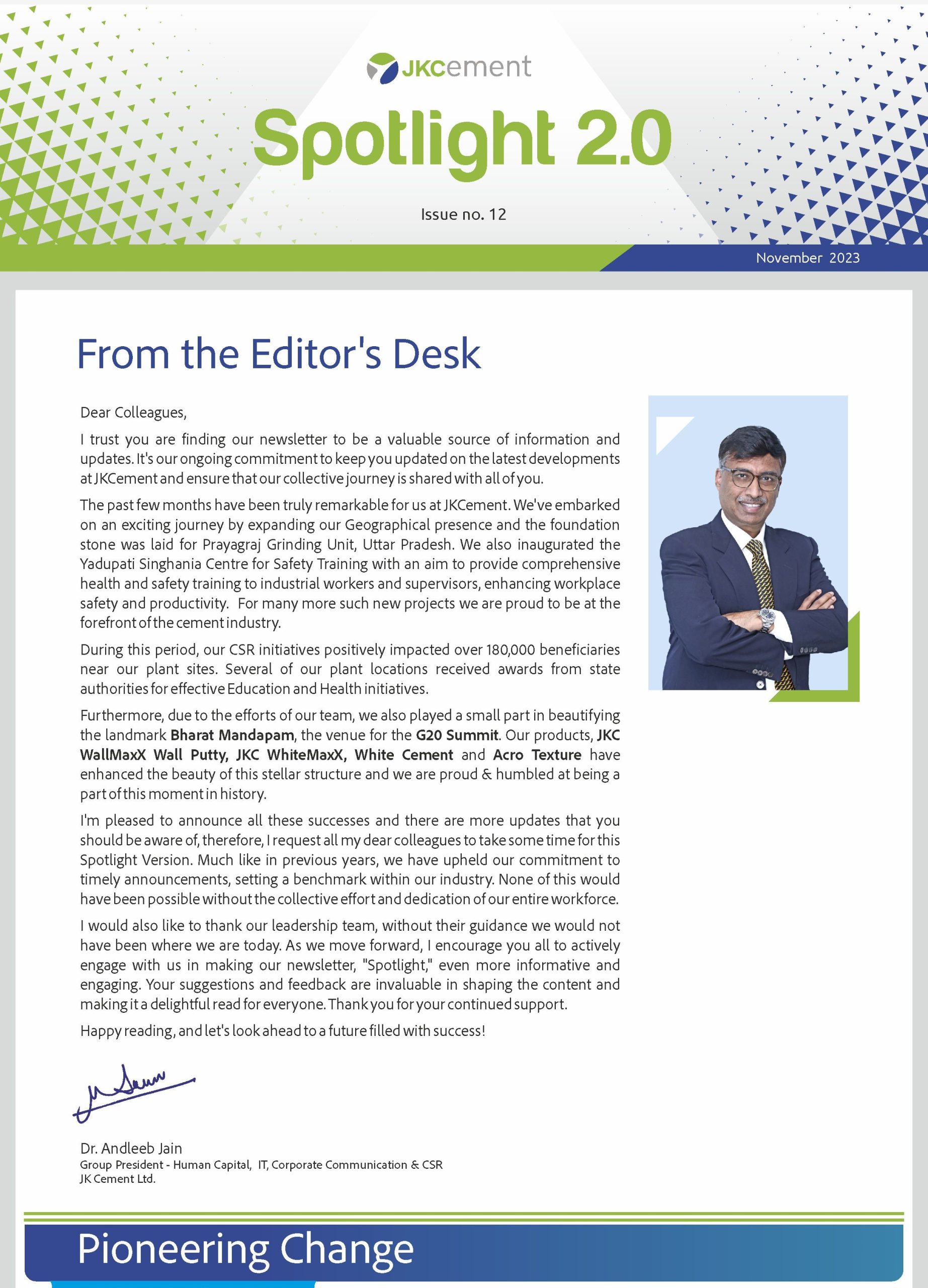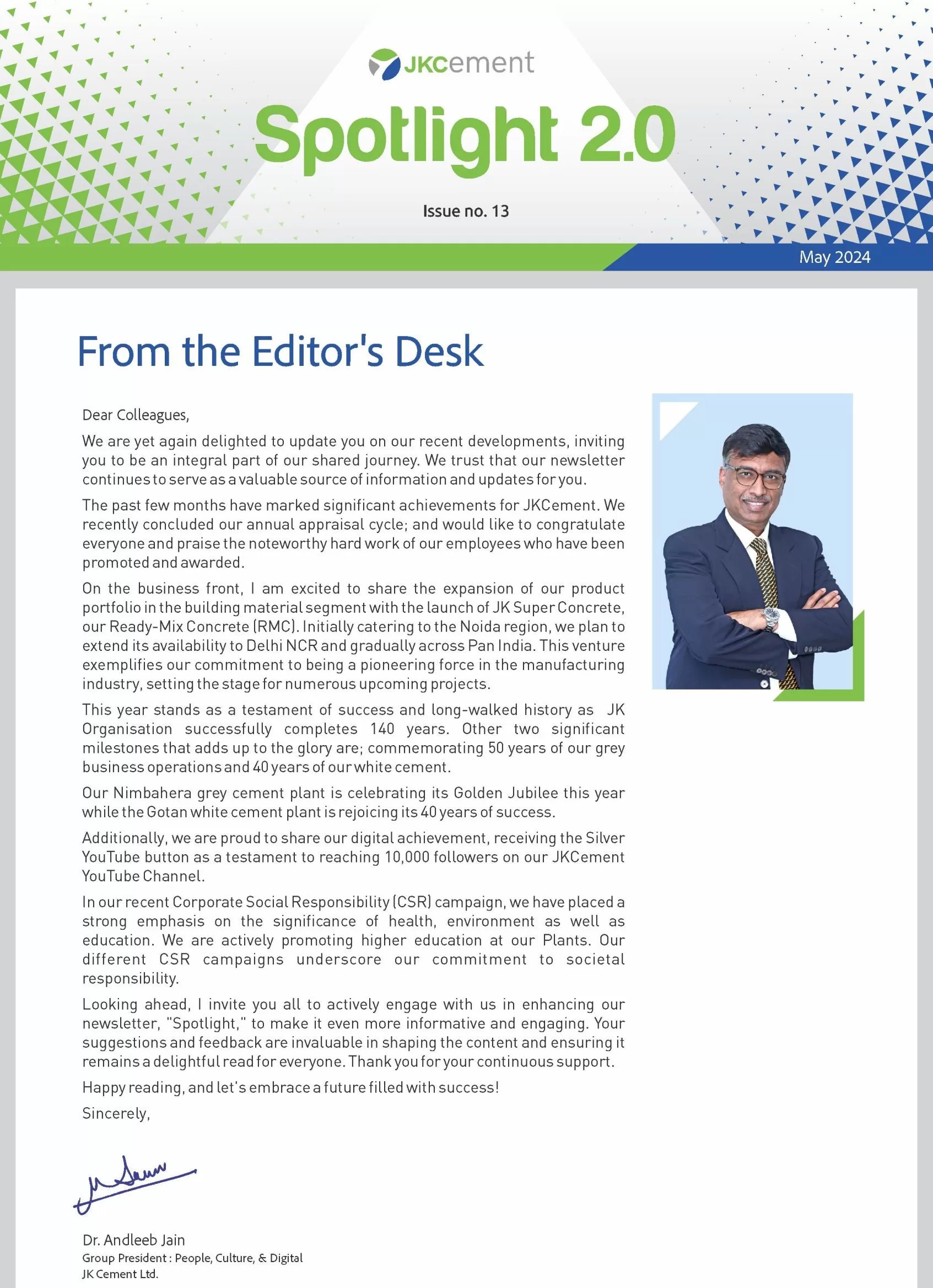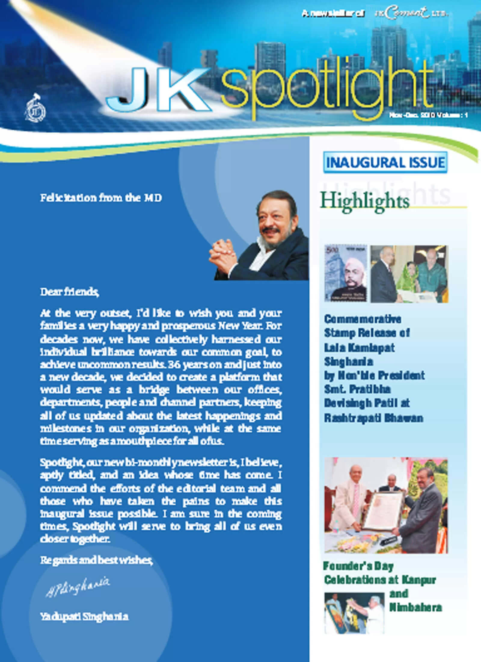 Launched in January 2010, the company newsletter, JK Spotlight has been a great unifier for our employees, channel partners and stakeholders, keeping them updated about the developments across the organization. With the aim of enhancing the reading experience for the members of the JK Cement family, we have launched a contemporary, ‘electronic’ version of our popular magazine – Spotlight 2.0