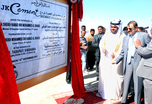 The foundation stone of JK Cement Works, Fujairah was laid by H.H. Sheikh Mohammed Bin Hamad Al Sharqi - Crown Prince of Fujairah, along with Late Shri Yadupati Singhania - MD & CEO, JK Cement Ltd. and Dr. Raghavpat Singhania - Managing Director- JK Cement Ltd.